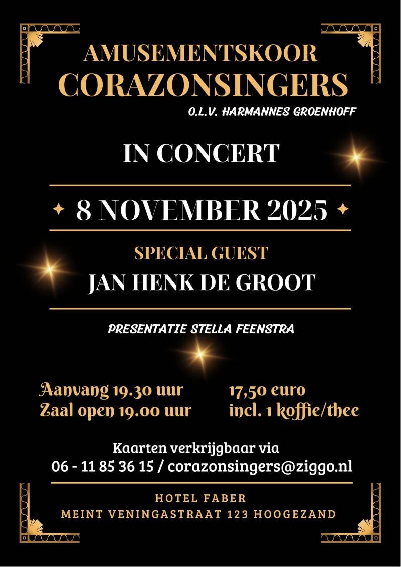 Gemengd, amusementskoor CorazonSingers uit Hoogezand geeft op zaterdag 8 november 2025 een concert in Hotel Faber.